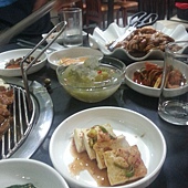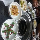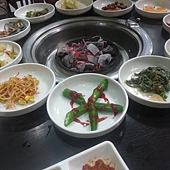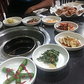 在我面前的小菜~秋葵沾韓式辣醬.涼伴龍鬚葉.豆腐.泡菜.豆芽菜.玉子燒.都吃得很開心